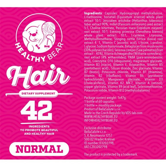 Product of BellaSalute s.r.o. | Made in the Czech Republic by VDS-lab.com Development of the Healthy Bear - HAIR : PharmDr. Alice Sychrová, Ph.D. The product is protected by a trademark.