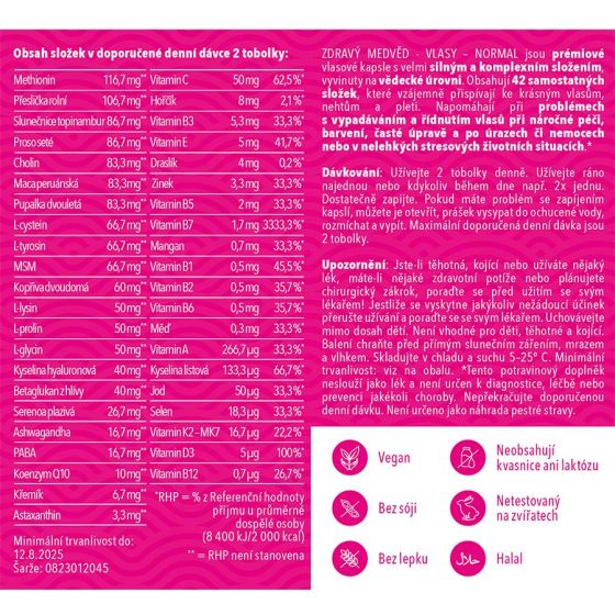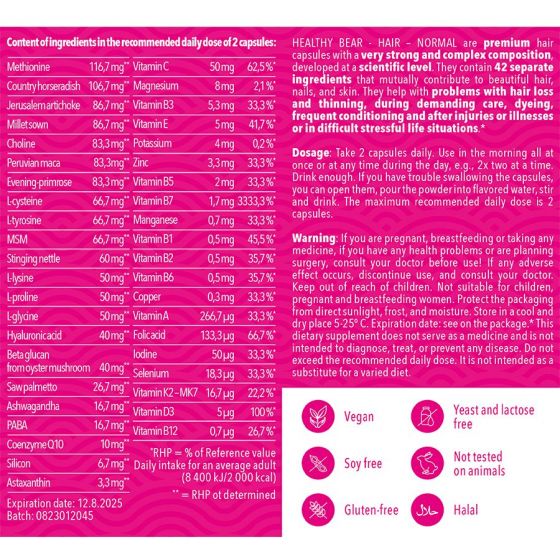 HEALTHY BEAR - HAIR - STRONG are premium hair capsules with a very strong and complex composition, developed at a scientific level. They contain 42 separate ingredients that mutually contribute to beautiful hair, nails and skin. They help with problems with hair loss and thinning during demanding care, dyeing, frequent conditioning and after injuries or illnesses or in difficult stressful life situations. * Vegan - Soy free - Gluten free - Yeast and lactose free - Not tested on animals